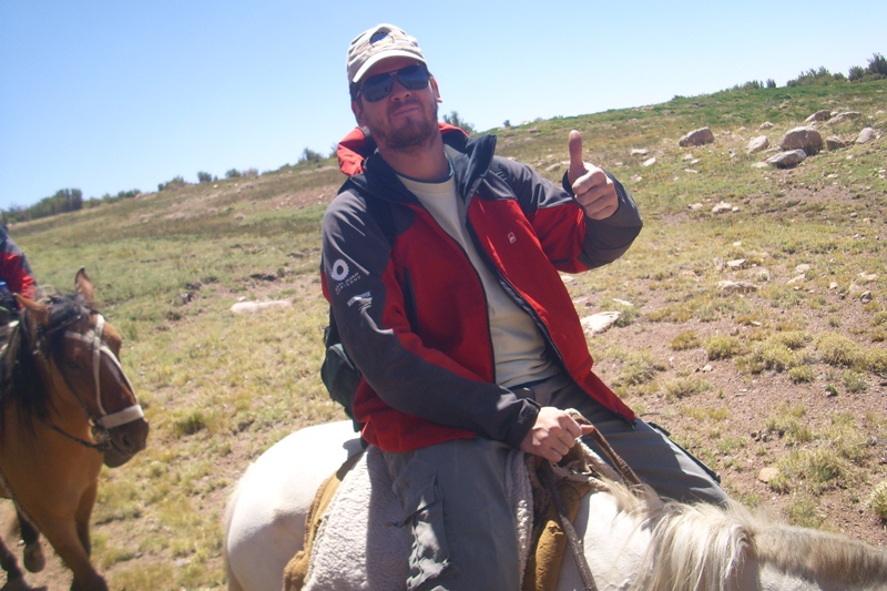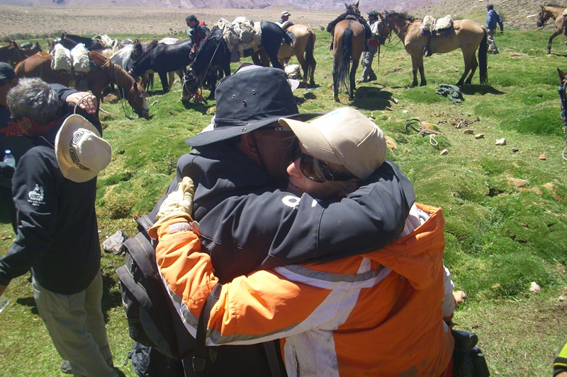“Si fuera por mí, iría y volvería a caballo, me encanta, tengo ganas de quedarme acá”, dice el chico mientras juega con la perra, acostado en plena montaña. No habla de cansancio, ni de falta de oxígeno, ni de sed. Le gusta andar y se nota. Sólo protesta cuando, después del acto en el límite, el helicóptero oficial lo regresa a casa junto a su padre, Gioja, el embajador Zaldívar, sus tres hijos y yerno. El resto (incluidas las 15 mujeres) vuelven a caballo mirando pasar el helicóptero.