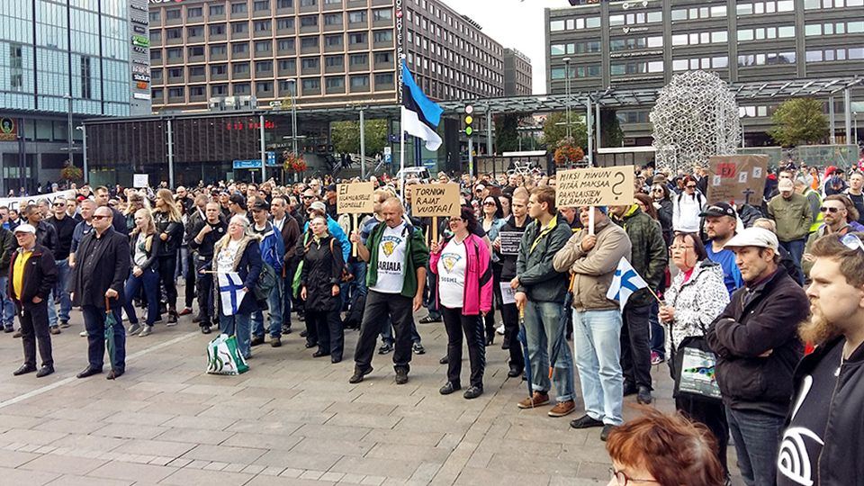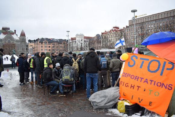 Ha habido manifestaciones de los refugiados y los opositores enfrente de la estación de trenes de Helsinki y delante de Kiasma.